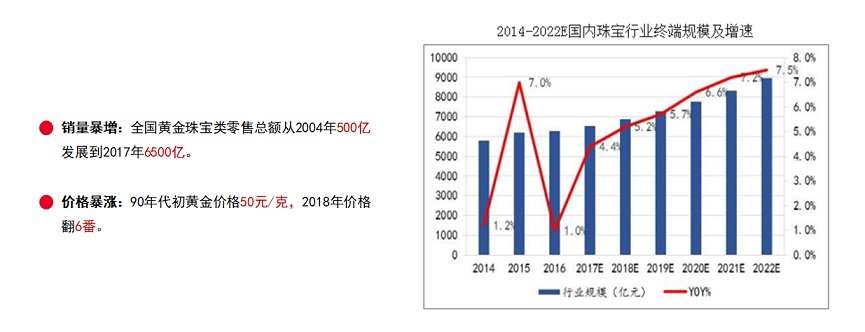 中國黃金珠寶市場總規(guī)模將突破萬億,全國黃金珠寶類零售總額從2004年500億發(fā)展到2017年6500億。90年代初黃金價格50元/克,2018年價格翻6番