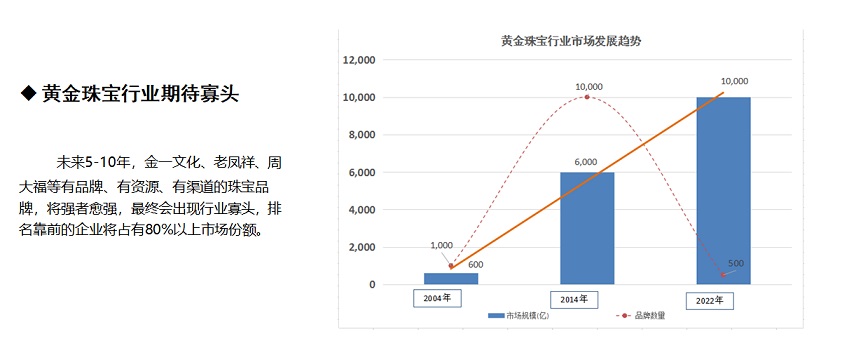 整合是大趨勢,期待寡頭出現(xiàn) 。未來5-10年,金一文化、老鳳祥、周大福等有品牌、有資源、有渠道的珠寶品牌,將強者愈強,最終會出現(xiàn)行業(yè)寡頭,排名靠前的企業(yè)將占有80%以上市場份額。