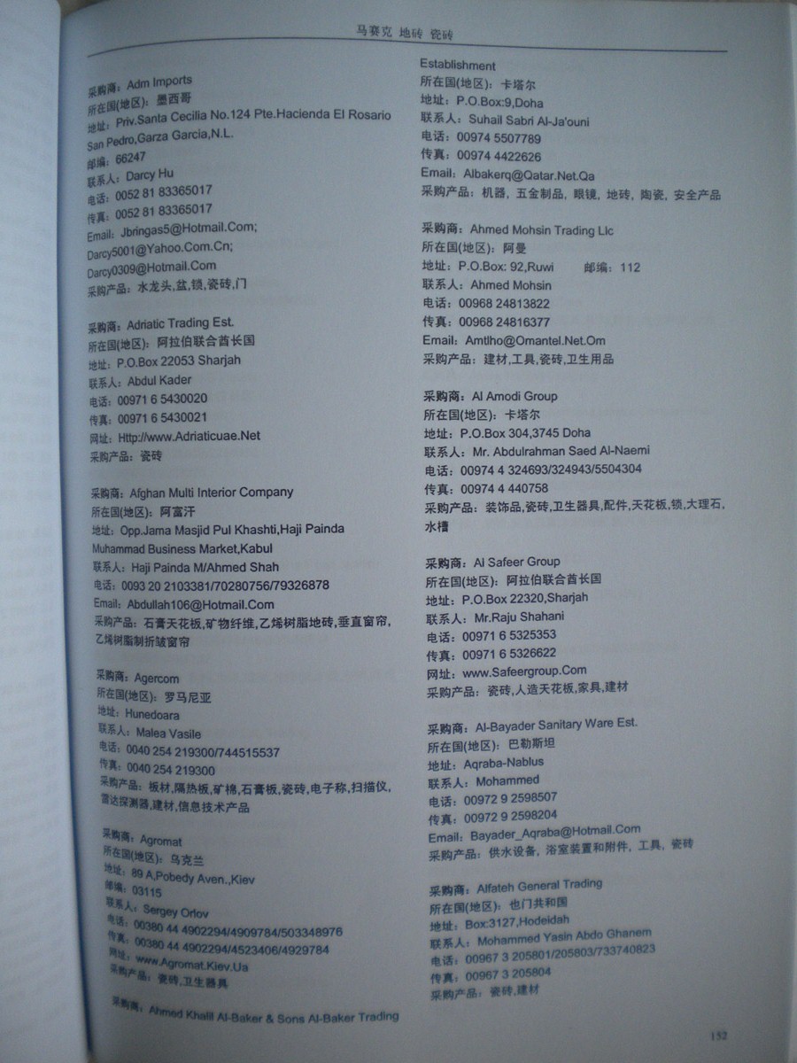 書刊簡介:《全球采商黃頁》系列叢書是由全球最活躍的專業(yè)買家及重要國際性展會的到會采購商名片信息匯編而成,包含三十多個行業(yè)分類,匯集了各類產品的買家信息。其中收錄的每家采購商信息均是我們通過與買家面對面的登記整理收集而成,采購意向明確,針對性強。為了確保信息的準確性和時效性,我們定期進行跟進、回訪、補充及更新工作。每家采購商信息包括國別、公司名稱、聯(lián)系人、地址、電話、傳真、電郵、網址、采購產品等詳細內容,每冊《黃頁》約有兩千家左右的采購商信息。在當前國際出口形勢日趨嚴峻的環(huán)境下,如何降低成本開拓國際市場,是每個出口企業(yè)急需尋找的答案,我們相信通過我們10多年的外貿信息服務經驗和最新的國際買家資源服務,將會為您拓展全球市場提供最直接有效的幫助。專業(yè)對口的買家信息一定會幫助貴公司打開更廣闊的外貿市場!
