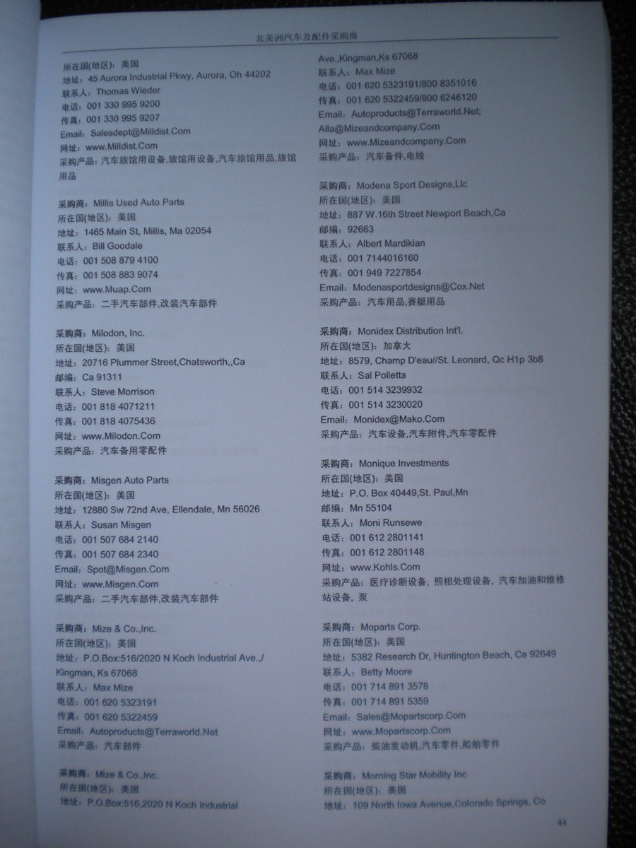 書刊簡(jiǎn)介:《全球采商黃頁(yè)》系列叢書是由全球最活躍的專業(yè)買家及重要國(guó)際性展會(huì)的到會(huì)采購(gòu)商名片信息匯編而成,包含三十多個(gè)行業(yè)分類,匯集了各類產(chǎn)品的買家信息。其中收錄的每家采購(gòu)商信息均是我們通過與買家面對(duì)面的登記整理收集而成,采購(gòu)意向明確,針對(duì)性強(qiáng)。為了確保信息的準(zhǔn)確性和時(shí)效性,我們定期進(jìn)行跟進(jìn)、回訪、補(bǔ)充及更新工作。每家采購(gòu)商信息包括國(guó)別、公司名稱、聯(lián)系人、地址、電話、傳真、電郵、網(wǎng)址、采購(gòu)產(chǎn)品等詳細(xì)內(nèi)容,每?jī)?cè)《黃頁(yè)》約有兩千家左右的采購(gòu)商信息。在當(dāng)前國(guó)際出口形勢(shì)日趨嚴(yán)峻的環(huán)境下,如何降低成本開拓國(guó)際市場(chǎng),是每個(gè)出口企業(yè)急需尋找的答案,我們相信通過我們10多年的外貿(mào)信息服務(wù)經(jīng)驗(yàn)和最新的國(guó)際買家資源服務(wù),將會(huì)為您拓展全球市場(chǎng)提供最直接有效的幫助。專業(yè)對(duì)口的買家信息一定會(huì)幫助貴公司打開更廣闊的外貿(mào)市場(chǎng)!