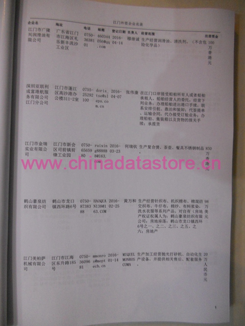 最新江門(mén)外資企業(yè)黃頁(yè)涵蓋了江門(mén)外商獨(dú)資企業(yè)、中外合資經(jīng)營(yíng)企業(yè)以及港、澳、臺(tái)資企業(yè),包括江門(mén)臺(tái)資日資企業(yè)黃頁(yè),江門(mén)外企黃頁(yè)具體內(nèi)容包括:企業(yè)名稱(chēng)、地址、電話、傳真、郵箱、經(jīng)營(yíng)范圍、注冊(cè)資金等信息;江門(mén)外資企業(yè)名單里面的企業(yè)都一些中外合資的大企業(yè),這些公司經(jīng)濟(jì)實(shí)力都比較雄厚,出口產(chǎn)品也比較多,業(yè)務(wù)范圍都比較廣,跟他們開(kāi)展業(yè)務(wù)往來(lái)都比較容易;有了江門(mén)臺(tái)企日企黃頁(yè)開(kāi)展業(yè)務(wù)也有了針對(duì)性,也省去了盲目去尋找客戶名單而浪費(fèi)的時(shí)間了,工作效率也會(huì)有很大的提高.歡迎需要的客戶及時(shí)聯(lián)系我們!
