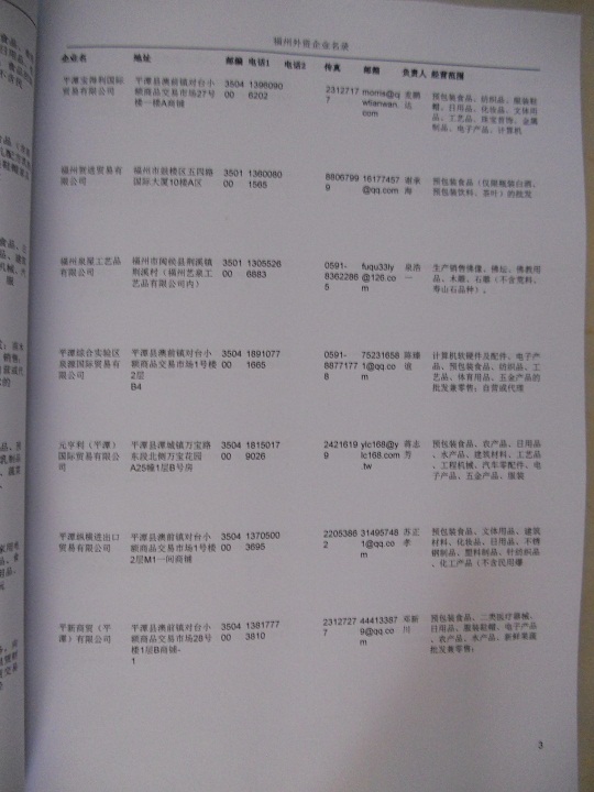 最新福州外資企業黃頁涵蓋了福州外商獨資企業、中外合資經營企業以及港、澳、臺資企業,包括福州臺資日資企業黃頁,福州外企黃頁具體內容包括:企業名稱、地址、電話、傳真、郵箱、經營范圍、注冊資金等信息;福州外資企業名單里面的企業都一些中外合資的大企業,這些公司經濟實力都比較雄厚,出口產品也比較多,業務范圍都比較廣,跟他們開展業務往來都比較容易;有了福州臺企日企黃頁開展業務也有了針對性,也省去了盲目去尋找客戶名單而浪費的時間了,工作效率也會有很大的提高.歡迎需要的客戶及時聯系我們!
