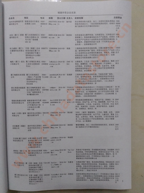 最新福建外資企業黃頁涵蓋了福建外商獨資企業、中外合資經營企業以及港、澳、臺資企業,包括福建日資臺資企業黃頁,福建外企黃頁具體內容包括:企業名稱、地址、電話、傳真、郵箱、經營范圍、注冊資金等信息;福建外資企業名單里面的企業都一些中外合資的大企業,這些公司經濟實力都比較雄厚,出口產品也比較多,業務范圍都比較廣,跟他們開展業務往來都比較容易;有了福建日企臺企黃頁開展業務也有了針對性,也省去了盲目去尋找客戶名單而浪費的時間了,工作效率也會有很大的提高.歡迎需要的客戶及時聯系我們!