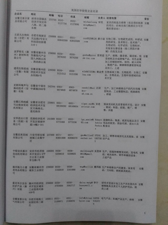 最新美國在華企業黃頁主要收錄了美國在中國境內的獨資、合資、合作經營等類型的企業通信黃頁,美國外商投資企業黃頁內容有:企業名稱、地址、電話、傳真、電子郵箱、經營范圍、注冊資金等;美資企業黃頁都是一些國際上的知名品牌企業在大陸地區設立的分公司及辦事機構,這類企業經濟實力、技術實力與品牌效應都比較強,與這類企業開展合作業務是許多國內企業夢寐以求的事情,因此在華美資企業名單是各個國內企業提高銷售業績必備的參考工具!