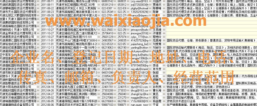 天津貨運代理公司名單數(shù)據(jù)為Excel格式,信息可任意修改、復制、打印、導出及導入到傳真、郵件群發(fā)等軟件中,無任何限制。