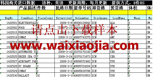 韓國海關(guān)進(jìn)出口數(shù)據(jù)(KRCD)共有10個字段(10列,EXCEL格式),含韓國進(jìn)口商(出口商)當(dāng)月產(chǎn)品進(jìn)口(出口)貿(mào)易額排序,及其聯(lián)系方式等