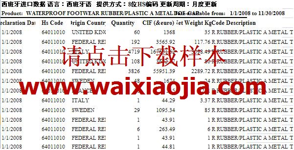 數(shù)據(jù)項(xiàng)目包含三大項(xiàng)目:進(jìn)出口商統(tǒng)計(jì): 日期、 HS 編碼、 HS 描述、公司名稱(數(shù)據(jù)年度更新)西班牙海關(guān)數(shù)據(jù)、進(jìn)出口商相關(guān)報(bào)告:公司名稱、公司基本信息、進(jìn)出口國(guó)別和區(qū)域、進(jìn)口商品類別、加強(qiáng)信息 進(jìn)出口商量?jī)r(jià)統(tǒng)計(jì): HS 編碼 ,交易國(guó)別 ,月份 ,交易數(shù)量 ,交易金額