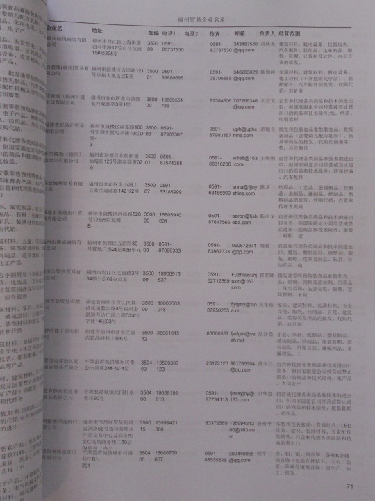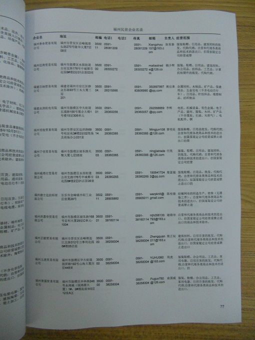 2021版最新福州企業(yè)黃頁(yè)包括《福州制造企業(yè)黃頁(yè)》、《福州貿(mào)易企業(yè)黃頁(yè)》、《福州民營(yíng)企業(yè)黃頁(yè)》、《福州外資企業(yè)黃頁(yè)》、《福州外貿(mào)企業(yè)黃頁(yè)》共五冊(cè),現(xiàn)優(yōu)惠價(jià):280元/冊(cè)。每?jī)?cè)內(nèi)容包括:?jiǎn)挝幻Q(chēng)、地址、郵編、電話、傳真、郵箱、經(jīng)營(yíng)范圍等;福州企業(yè)黃頁(yè)涵蓋了近幾年來(lái)最新成立的、有一定規(guī)模的企業(yè),具有非常高的營(yíng)銷(xiāo)價(jià)值。有了這套黃頁(yè)開(kāi)展業(yè)務(wù)也有了針對(duì)性,也省去了盲目去尋找客戶名單而浪費(fèi)的時(shí)間了,工作效率也會(huì)有很大的提高。歡迎需要福州企業(yè)黃頁(yè)的朋友及時(shí)聯(lián)系我們!