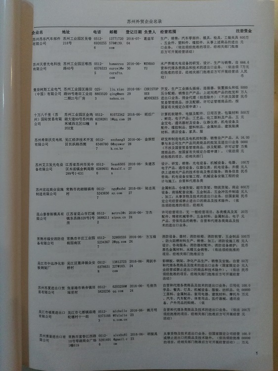 2021版最新蘇州企業(yè)黃頁包括《蘇州制造企業(yè)黃頁》、《蘇州貿(mào)易企業(yè)黃頁》、《蘇州民營企業(yè)黃頁》、《蘇州外資企業(yè)黃頁》、《蘇州外貿(mào)企業(yè)黃頁》共五冊,現(xiàn)優(yōu)惠價:280元/冊。每冊內(nèi)容包括:單位名稱、地址、郵編、電話、傳真、郵箱、經(jīng)營范圍等;蘇州企業(yè)黃頁涵蓋了近幾年來最新成立的、有一定規(guī)模的企業(yè),具有非常高的營銷價值。有了這套黃頁開展業(yè)務(wù)也有了針對性,也省去了盲目去尋找客戶名單而浪費的時間了,工作效率也會有很大的提高。歡迎需要蘇州企業(yè)黃頁的朋友及時聯(lián)系我們!