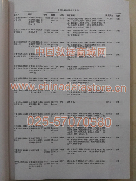 最新涂料油漆生產(chǎn)與貿(mào)易企業(yè)黃頁數(shù)據(jù)更新日期2024年12月最新,全國涂料油漆企業(yè)黃頁共26580條,都是具有一定規(guī)模的涂料油漆行業(yè)的注冊實(shí)體企業(yè),數(shù)據(jù)準(zhǔn)確率高,是您開展各項(xiàng)營銷活動(dòng)的必備資料。企業(yè)名單包括:企業(yè)名稱、地址、電話(以上必有,以下選有)、傳真、郵箱、登記日期、經(jīng)營范圍、注冊資金等信息。涂料油漆企業(yè)黃頁數(shù)據(jù)為Excel格式,信息可任意修改、復(fù)制、打印、導(dǎo)出及導(dǎo)入到傳真、郵件群發(fā)等軟件中,無任何限制。