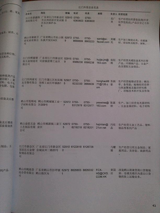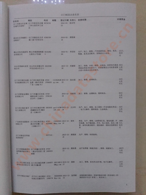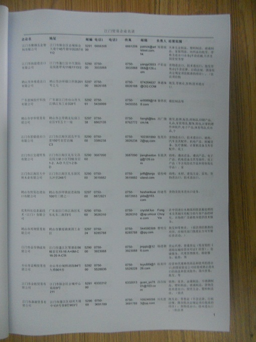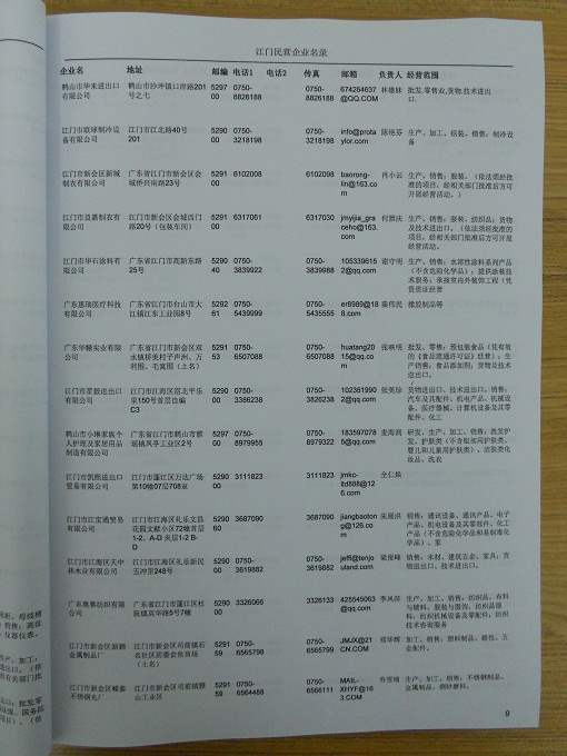 2021版最新江門企業(yè)黃頁包括《江門制造企業(yè)黃頁》、《江門貿(mào)易企業(yè)黃頁》、《江門民營企業(yè)黃頁》、《江門外資企業(yè)黃頁》、《江門外貿(mào)企業(yè)黃頁》共五冊,現(xiàn)優(yōu)惠價:280元/冊。每冊內(nèi)容包括:單位名稱、地址、郵編、電話、傳真、郵箱、經(jīng)營范圍等;江門企業(yè)黃頁涵蓋了近幾年來最新成立的、有一定規(guī)模的企業(yè),具有非常高的營銷價值。有了這套黃頁開展業(yè)務(wù)也有了針對性,也省去了盲目去尋找客戶名單而浪費(fèi)的時間了,工作效率也會有很大的提高。歡迎需要江門企業(yè)黃頁的朋友及時聯(lián)系我們!