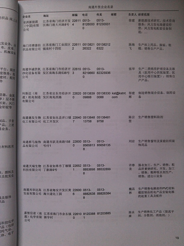 2021版最新南通企業(yè)黃頁(yè)包括《南通制造企業(yè)黃頁(yè)》、《南通貿(mào)易企業(yè)黃頁(yè)》、《南通民營(yíng)企業(yè)黃頁(yè)》、《南通外資企業(yè)黃頁(yè)》、《南通外貿(mào)企業(yè)黃頁(yè)》共五冊(cè),現(xiàn)優(yōu)惠價(jià):280元/冊(cè)。每?jī)?cè)內(nèi)容包括:?jiǎn)挝幻Q、地址、郵編、電話、傳真、郵箱、經(jīng)營(yíng)范圍等;南通企業(yè)黃頁(yè)涵蓋了近幾年來(lái)最新成立的、有一定規(guī)模的企業(yè),具有非常高的營(yíng)銷價(jià)值。有了這套黃頁(yè)開(kāi)展業(yè)務(wù)也有了針對(duì)性,也省去了盲目去尋找客戶名單而浪費(fèi)的時(shí)間了,工作效率也會(huì)有很大的提高。歡迎需要南通企業(yè)黃頁(yè)的朋友及時(shí)聯(lián)系我們!