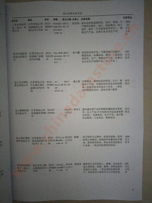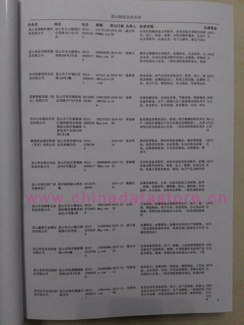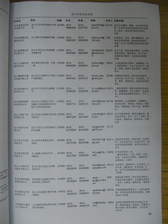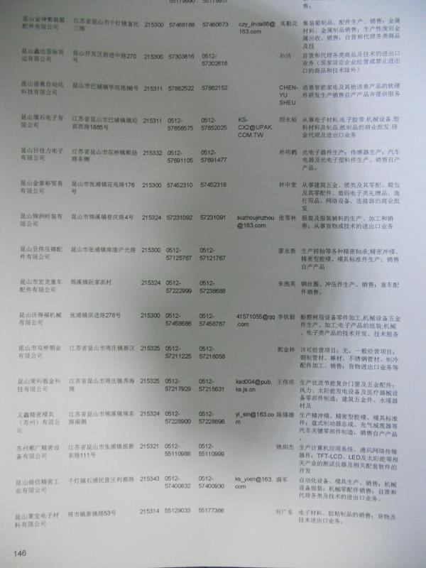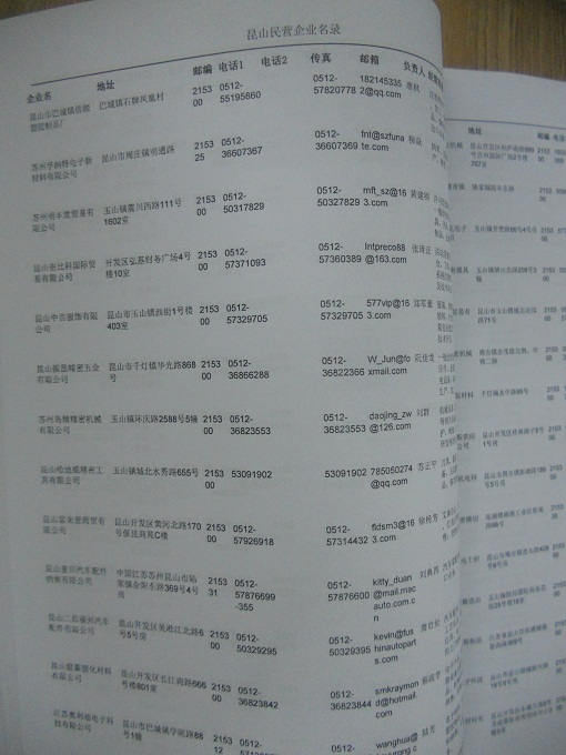 2021版最新昆山企業(yè)黃頁包括《昆山制造企業(yè)黃頁》、《昆山貿(mào)易企業(yè)黃頁》、《昆山民營企業(yè)黃頁》、《昆山外資企業(yè)黃頁》、《昆山外貿(mào)企業(yè)黃頁》共五冊,現(xiàn)優(yōu)惠價(jià):280元/冊。每冊內(nèi)容包括:單位名稱、地址、郵編、電話、傳真、郵箱、經(jīng)營范圍等;昆山企業(yè)黃頁涵蓋了近幾年來最新成立的、有一定規(guī)模的企業(yè),具有非常高的營銷價(jià)值。有了這套黃頁開展業(yè)務(wù)也有了針對性,也省去了盲目去尋找客戶名單而浪費(fèi)的時(shí)間了,工作效率也會(huì)有很大的提高。歡迎需要昆山企業(yè)黃頁的朋友及時(shí)聯(lián)系我們!