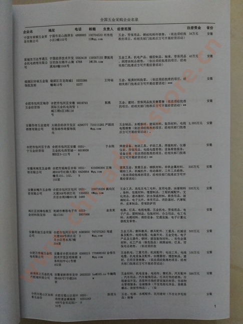 2024年新版中國(guó)五金采購(gòu)企業(yè)黃頁(yè),收錄了全國(guó)各地經(jīng)營(yíng)范圍涉及五金產(chǎn)品的貿(mào)易企業(yè),這些都是頗具實(shí)力的五金產(chǎn)品的中國(guó)采購(gòu)商。黃頁(yè)內(nèi)容包含:企業(yè)名稱、地址、電話、傳真、郵箱、經(jīng)營(yíng)范圍、省份、注冊(cè)資金等信息。該套黃頁(yè)包含一個(gè)黃頁(yè)光碟加一冊(cè)紙質(zhì)書刊,全國(guó)價(jià)格:1500元,省/直轄市價(jià)格:400元,城市價(jià)格:200元,共收錄了全國(guó)各地大概29596(統(tǒng)計(jì)日期:2018.1)家五金產(chǎn)品采購(gòu)企業(yè)。黃頁(yè)光碟中是EXCEL格式,信息可任意修改、復(fù)制、打印、導(dǎo)出及導(dǎo)入到傳真、郵件群發(fā)等軟件中,無任何限制。