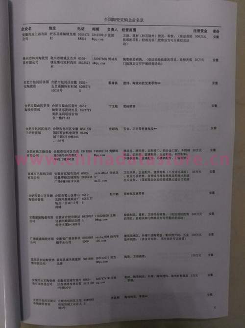 2024年新版中國(guó)陶瓷采購(gòu)企業(yè)黃頁(yè),收錄了全國(guó)各地經(jīng)營(yíng)范圍涉及陶瓷產(chǎn)品的貿(mào)易企業(yè),這些都是頗具實(shí)力的陶瓷產(chǎn)品的中國(guó)采購(gòu)商。黃頁(yè)內(nèi)容包含:企業(yè)名稱(chēng)、地址、電話、傳真、郵箱、經(jīng)營(yíng)范圍、省份、注冊(cè)資金等信息。該套黃頁(yè)包含一個(gè)黃頁(yè)光碟加一冊(cè)紙質(zhì)書(shū)刊,,全國(guó)價(jià)格:1500元,省/直轄市價(jià)格:400元,城市價(jià)格:200元,共收錄了全國(guó)各地大概10500(統(tǒng)計(jì)日期:2018.1)家陶瓷產(chǎn)品采購(gòu)企業(yè)。黃頁(yè)光碟中是EXCEL格式,信息可任意修改、復(fù)制、打印、導(dǎo)出及導(dǎo)入到傳真、郵件群發(fā)等軟件中,無(wú)任何限制。