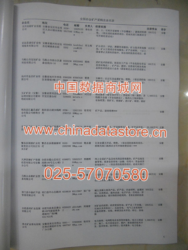 2024年新版中國冶金礦產采購企業(yè)黃頁,收錄了全國各地經營范圍涉及冶金礦產產品的貿易企業(yè),這些都是頗具實力的冶金礦產產品的中國采購商。黃頁內容包含:企業(yè)名稱、地址、電話、傳真、郵箱、經營范圍、省份、注冊資金等信息。該套黃頁包含一個黃頁光碟加一冊紙質書刊,全國價格:1500元,省/直轄市價格:400元,城市價格:200元,共收錄了全國各地大概8042(統(tǒng)計日期:2018.1)家冶金礦產產品采購企業(yè)。黃頁光碟中是EXCEL格式,信息可任意修改、復制、打印、導出及導入到傳真、郵件群發(fā)等軟件中,無任何限制。