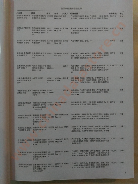 2024年新版中國(guó)汽配采購(gòu)企業(yè)黃頁(yè),收錄了全國(guó)各地經(jīng)營(yíng)范圍涉及汽配產(chǎn)品的貿(mào)易企業(yè),這些都是頗具實(shí)力的汽配產(chǎn)品的中國(guó)采購(gòu)商。黃頁(yè)內(nèi)容包含:企業(yè)名稱、地址、電話、傳真、郵箱、經(jīng)營(yíng)范圍、省份、注冊(cè)資金等信息。該套黃頁(yè)包含一個(gè)黃頁(yè)光碟加一冊(cè)紙質(zhì)書(shū)刊,全國(guó)價(jià)格:1500元,省/直轄市價(jià)格:400元,城市價(jià)格:200元,共收錄了全國(guó)各地大概8952(統(tǒng)計(jì)日期:2018.1)家汽配產(chǎn)品采購(gòu)企業(yè)。黃頁(yè)光碟中是EXCEL格式,信息可任意修改、復(fù)制、打印、導(dǎo)出及導(dǎo)入到傳真、郵件群發(fā)等軟件中,無(wú)任何限制。