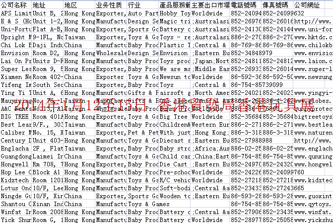 簡介:2014年香港貿(mào)發(fā)局展會會刊共收錄30個展會參展商信息。數(shù)據(jù)格式EXCEL,會刊內(nèi)容包含:公司名稱、地址、地區(qū)、業(yè)務(wù)性質(zhì)、行業(yè)、產(chǎn)品服務(wù)范圍、出口市場、電話、傳真、網(wǎng)址。