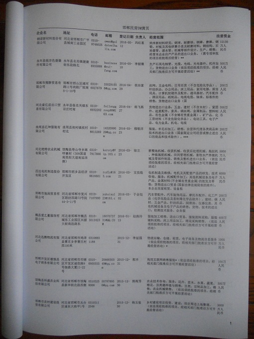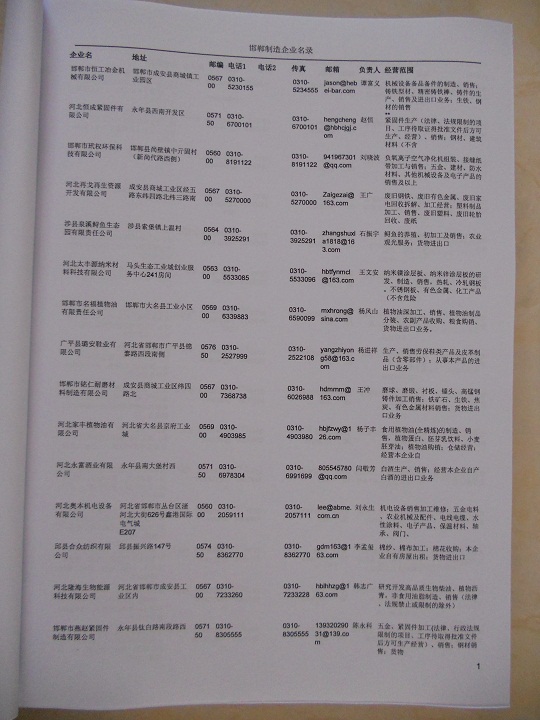 2021版最新邯鄲企業(yè)黃頁包括《邯鄲制造企業(yè)黃頁》、《邯鄲民營企業(yè)黃頁》,現(xiàn)優(yōu)惠價(jià):280元/冊(cè)。每冊(cè)內(nèi)容包括:單位名稱、地址、郵編、電話、傳真、郵箱、經(jīng)營范圍等;邯鄲企業(yè)黃頁涵蓋了近幾年來最新成立的、有一定規(guī)模的企業(yè),具有非常高的營銷價(jià)值。有了這套黃頁開展業(yè)務(wù)也有了針對(duì)性,也省去了盲目去尋找客戶名單而浪費(fèi)的時(shí)間了,工作效率也會(huì)有很大的提高。歡迎需要邯鄲企業(yè)黃頁的朋友及時(shí)聯(lián)系我們!