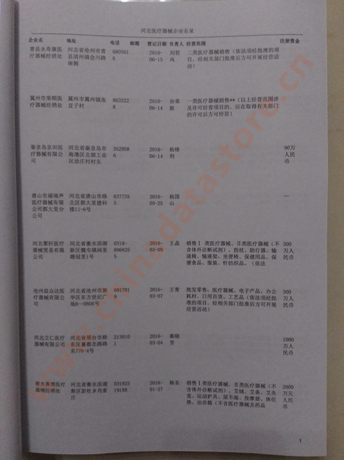 | 河北醫療器械企業黃頁 | 所有河北醫療器械企業黃頁 | 80% - 90% | 600元 | 附贈一冊河北醫療器械紙質印刷品 |