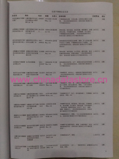 最新不銹鋼生產(chǎn)與貿(mào)易企業(yè)黃頁數(shù)據(jù)更新日期2024年12月最新,全國不銹鋼企業(yè)黃頁共111380條,都是具有一定規(guī)模的不銹鋼行業(yè)的注冊實(shí)體企業(yè),數(shù)據(jù)準(zhǔn)確率高,是您開展各項(xiàng)營銷活動(dòng)的必備資料。企業(yè)名單包括:企業(yè)名稱、地址、電話(以上必有,以下選有)、傳真、郵箱、登記日期、經(jīng)營范圍、注冊資金等信息。不銹鋼企業(yè)黃頁數(shù)據(jù)為Excel格式,信息可任意修改、復(fù)制、打印、導(dǎo)出及導(dǎo)入到傳真、郵件群發(fā)等軟件中,無任何限制。