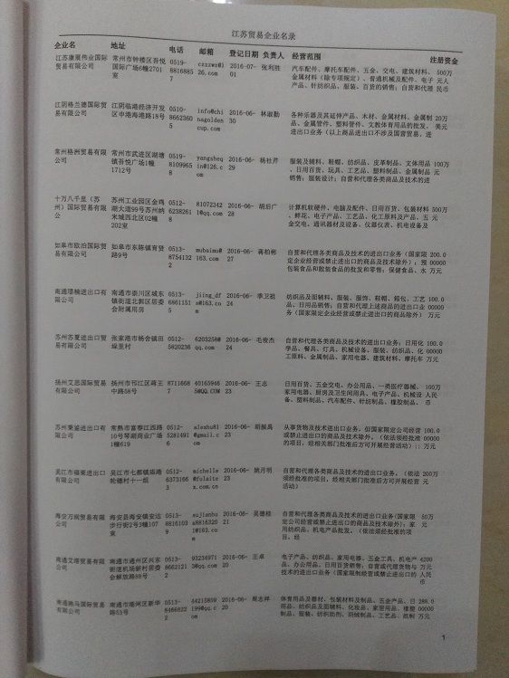 2021版最新江蘇企業(yè)黃頁包括《江蘇制造企業(yè)黃頁》、《江蘇貿(mào)易企業(yè)黃頁》、《江蘇民營企業(yè)黃頁》共三冊,優(yōu)惠價:280元/冊。每冊內(nèi)容包括:單位名稱、地址、郵編、電話、傳真、郵箱、經(jīng)營范圍等;江蘇企業(yè)黃頁涵蓋了近幾年來最新成立的、有一定規(guī)模的企業(yè),具有非常高的營銷價值。有了這套黃頁開展業(yè)務(wù)也有了針對性,也省去了盲目去尋找客戶名單而浪費的時間了,工作效率也會有很大的提高。歡迎需要江蘇企業(yè)黃頁的朋友及時聯(lián)系我們!
