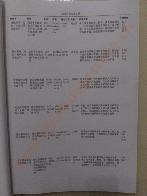 最新武漢外資企業(yè)黃頁涵蓋了武漢外商獨資企業(yè)、中外合資經營企業(yè)以及港、澳、臺資企業(yè),包括武漢日資臺資企業(yè)黃頁,武漢外企黃頁具體內容包括:企業(yè)名稱、地址、電話、傳真、郵箱、經營范圍、注冊資金等信息;武漢外資企業(yè)名單里面的企業(yè)都一些中外合資的大企業(yè),這些公司經濟實力都比較雄厚,出口產品也比較多,業(yè)務范圍都比較廣,跟他們開展業(yè)務往來都比較容易;有了武漢臺企日企黃頁開展業(yè)務也有了針對性,也省去了盲目去尋找客戶名單而浪費的時間了,工作效率也會有很大的提高.歡迎需要的客戶及時聯系我們!