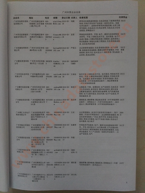 廣州外貿(mào)企業(yè)黃頁包括:外貿(mào)企業(yè)名稱、地址、電話、傳真、郵箱、經(jīng)營范圍、注冊資金等信息。