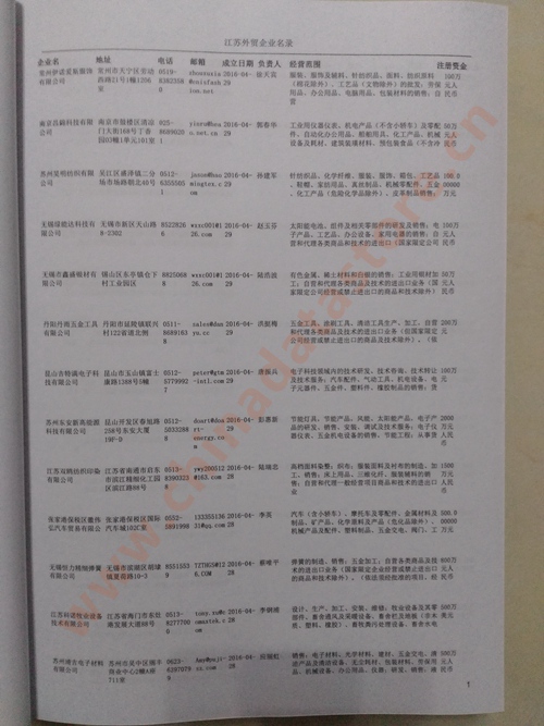 江蘇外貿(mào)企業(yè)黃頁(yè)包括:外貿(mào)企業(yè)名稱、地址、電話、傳真、郵箱、經(jīng)營(yíng)范圍、注冊(cè)資金等信息。