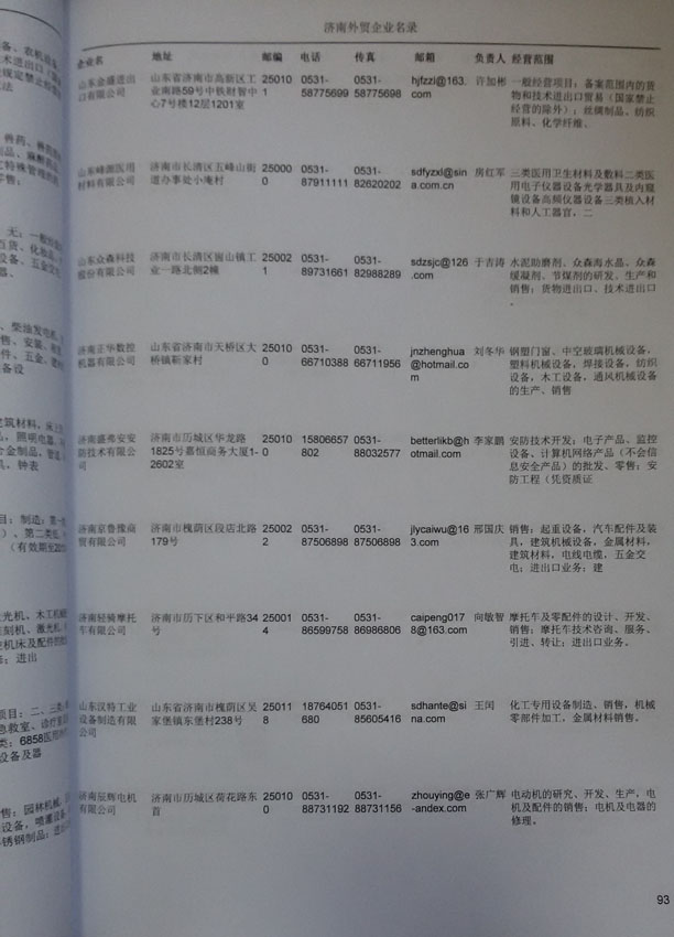 濟南外貿企業(yè)黃頁包括:外貿企業(yè)名稱、地址、電話、傳真、郵箱、經營范圍、注冊資金等信息。
