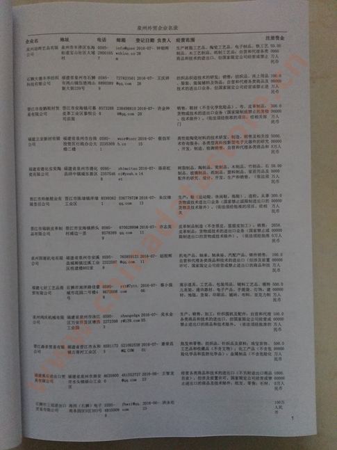 泉州外貿企業黃頁包括:外貿企業名稱、地址、電話、傳真、郵箱、經營范圍、注冊資金等信息。