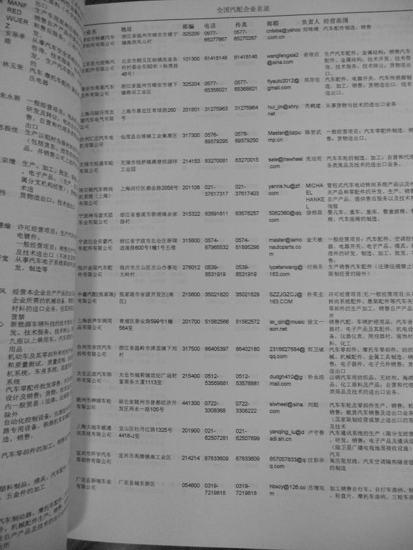 汽車配件外貿企業黃頁包括:外貿企業名稱、地址、電話、傳真、郵箱、經營范圍、注冊資金等信息。