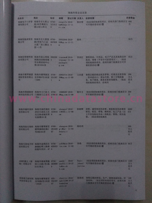 珠海外貿(mào)企業(yè)黃頁包括:外貿(mào)企業(yè)名稱、地址、電話、傳真、郵箱、經(jīng)營(yíng)范圍、注冊(cè)資金等信息。