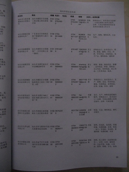 汕頭外貿(mào)企業(yè)黃頁包括:外貿(mào)企業(yè)名稱、地址、電話、傳真、郵箱、經(jīng)營范圍、注冊(cè)資金等信息。