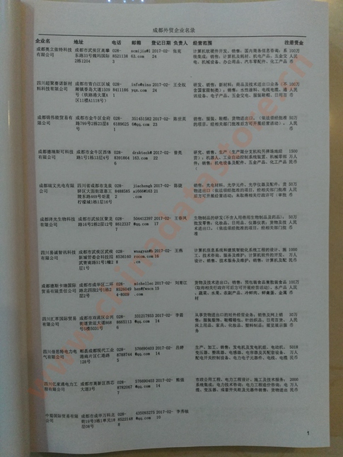 成都外貿(mào)企業(yè)黃頁(yè)包括:外貿(mào)企業(yè)名稱(chēng)、地址、電話、傳真、郵箱、經(jīng)營(yíng)范圍、注冊(cè)資金等信息。