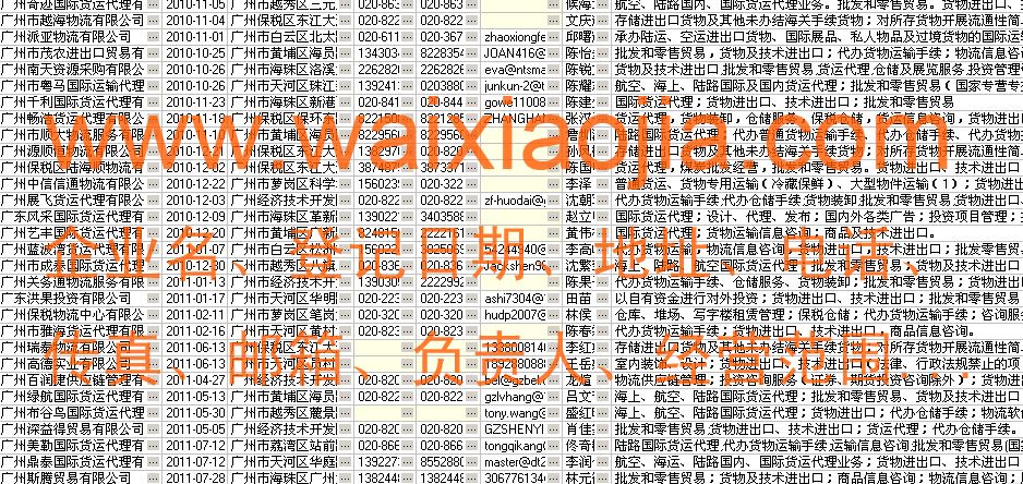 廣州貨運(yùn)代理公司名單數(shù)據(jù)為Excel格式,信息可任意修改、復(fù)制、打印、導(dǎo)出及導(dǎo)入到傳真、郵件群發(fā)等軟件中,無(wú)任何限制。