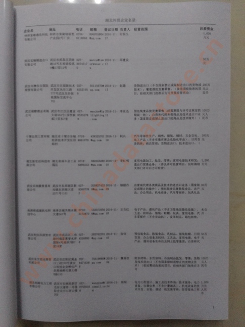 湖北外貿企業黃頁包括:外貿企業名稱、地址、電話、傳真、郵箱、經營范圍、注冊資金等信息。