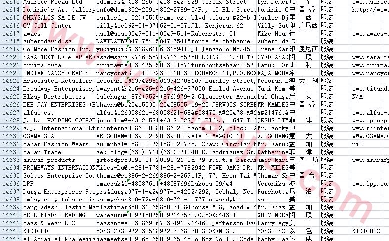服裝、服飾采購(gòu)商名單數(shù)據(jù)為Excel格式,信息可任意修改、復(fù)制、打印、導(dǎo)出及導(dǎo)入到傳真、郵件群發(fā)等軟件中,無(wú)任何限制。