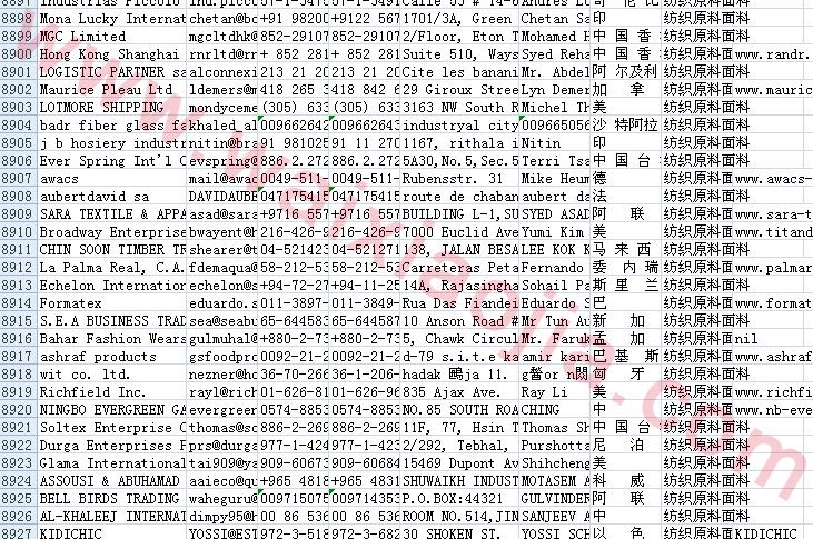 紡織原料面料采購商名單數(shù)據(jù)為Excel格式,信息可任意修改、復(fù)制、打印、導(dǎo)出及導(dǎo)入到傳真、郵件群發(fā)等軟件中,無任何限制。