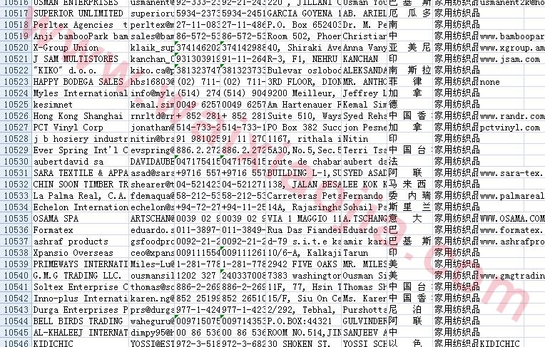 家用紡織品采購商名單數(shù)據(jù)為Excel格式,信息可任意修改、復制、打印、導出及導入到傳真、郵件群發(fā)等軟件中,無任何限制。