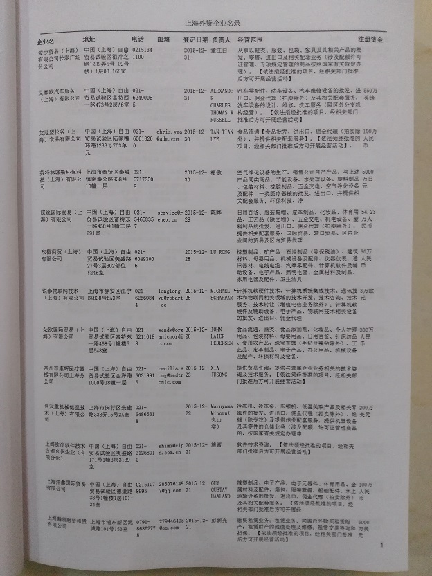 最新上海外資企業(yè)黃頁涵蓋了上海外商獨資企業(yè)、中外合資經營企業(yè)以及港、澳、臺資企業(yè),包括上海日企臺企黃頁等,具體內容包括:企業(yè)名稱、地址、電話、傳真、郵箱、經營范圍、注冊資金等信息;上海外資企業(yè)名單里面的企業(yè)都一些中外合資的大企業(yè),這些公司經濟實力都比較雄厚,出口產品也比較多,業(yè)務范圍都比較廣,跟他們開展業(yè)務往來都比較容易;有了上海日資臺資等企業(yè)黃頁開展業(yè)務也有了針對性,也省去了盲目去尋找客戶名單而浪費的時間了,工作效率也會有很大的提高.歡迎需要客戶及時聯(lián)系我們!