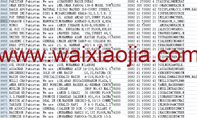 巴基斯坦采購商名單數(shù)據(jù)為Excel格式,信息可任意修改、復(fù)制、打印、導(dǎo)出及導(dǎo)入到傳真、郵件群發(fā)等軟件中,無任何限制。
